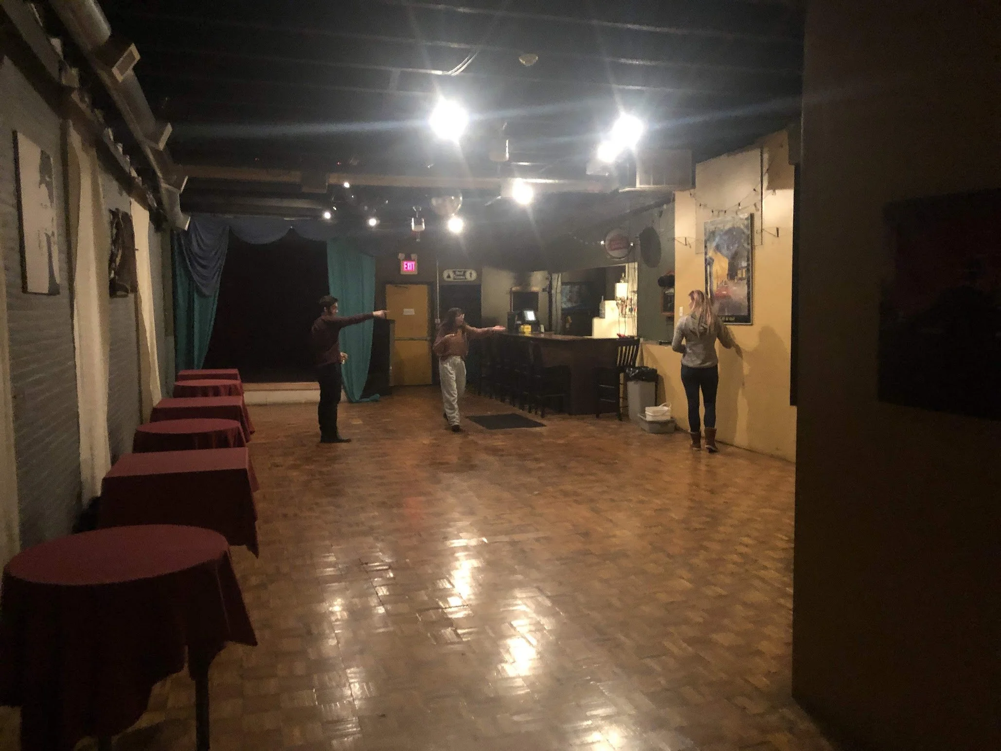 Improv in the round. Our stage design at the White Pines Place became a raised platform in the middle of the room, surrounded by chairs and sofas. Actors in our shows entered and exited from anywhere, and learned to use subtle, circular moves to open themselves up to audience around the room. At its best, it created a wonderful, intimate atmosphere of shared creative experience.