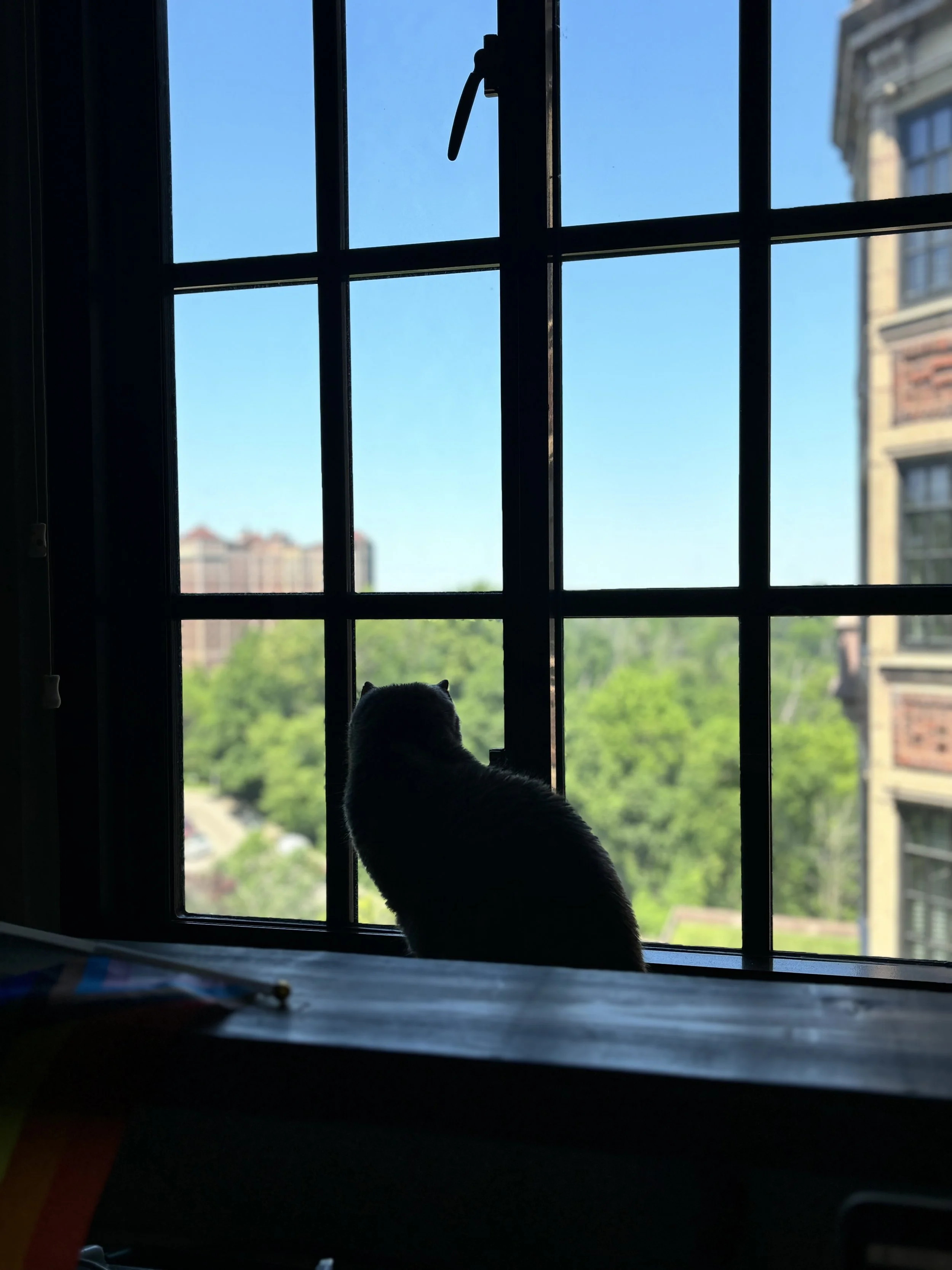 Here is a picture of one our sources of wisdom and experience, Ben's cat Lucy Blue, taking in the view from her new home.